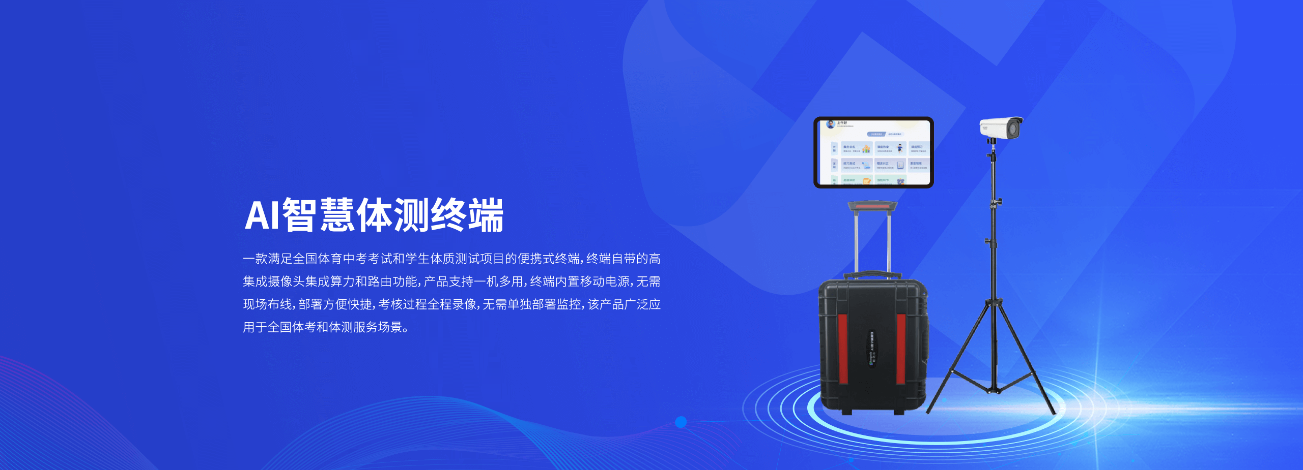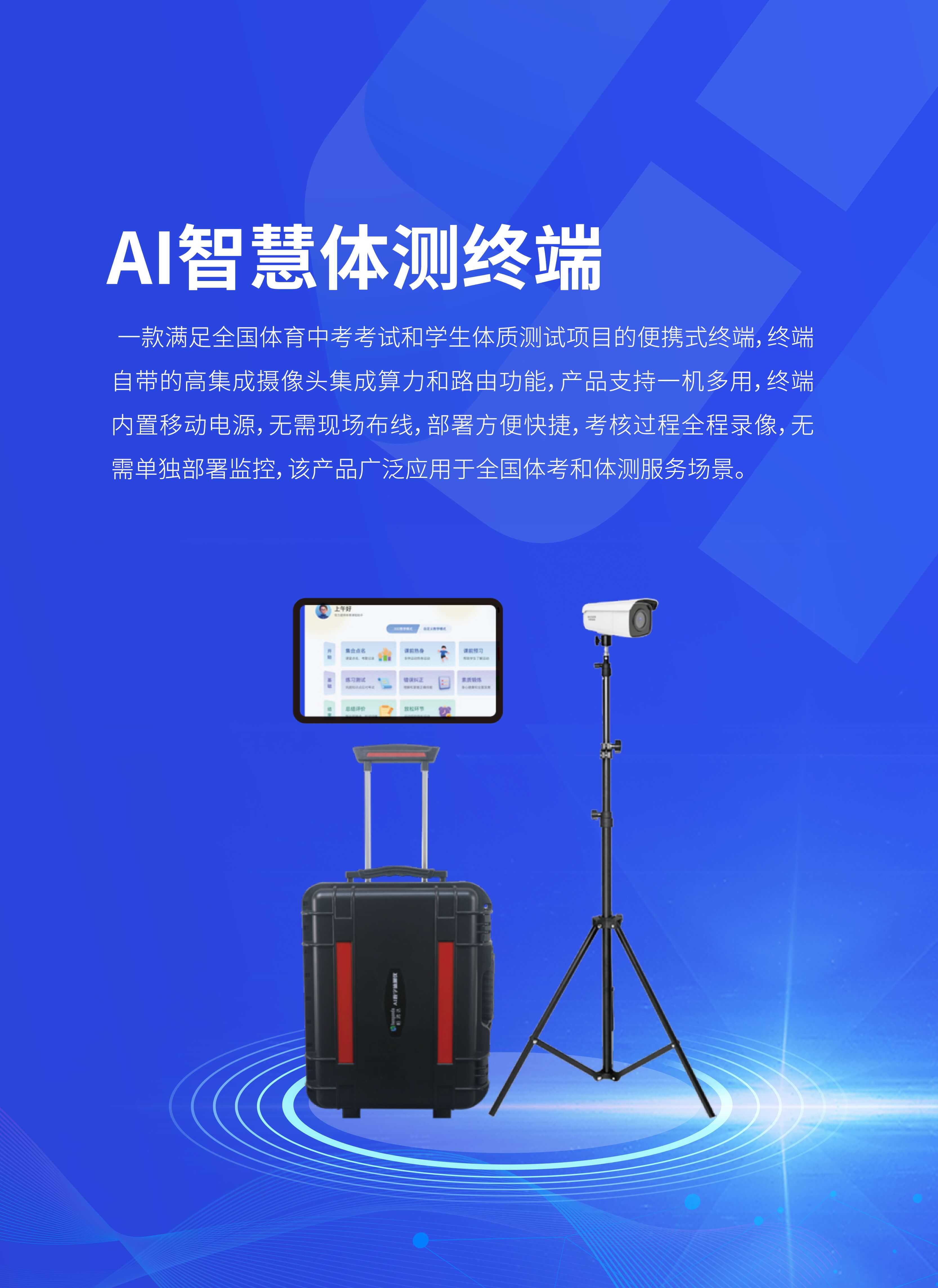 AI智慧体测终端是一款满足全国体育中考考试和学生体质测试项目的便携式终端,终端自带的高集成摄像头集成算力和路由功能,产品支持一机多用,终端内置移动电源,无需现场布线,部署方便快捷,考核过程全程录像,无需单独部署监控该产品广泛应用于全国体考和体测服务场景。